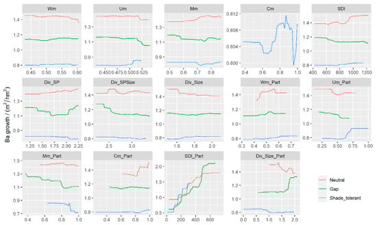 When considering Wm_part, neutral had a greater impact on BAI than gap and shade_tolerant. The BAI of gap decreased first and then gradually stabilized with the increase in Um_Part in gap, while the BAI of shade_tolerant increased first (after a period of quiescent stability) and then tended to be stable with the increase in Um_Part in shade_tolerant (Figure 3). Cm_Part of neutral with values predominantly distributed among 0.6 and 1.0, which was positively correlated with the BAI of neutral. By comparison, Cm_Part of gap and Cm_Part of shade_tolerant had less influence on BAI. When it came to Mm_Part, the relationship between BAI and neutral was relatively weak; however, BAI was negatively correlated with gap and shade_tolerant. The effects of the four diversity indicators on shade_tolerant were negligible. For Div_Size_Part, the effects of gap and neutral were inconsistent.