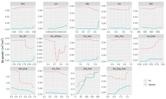 The BAI of fir and spruce first stayed constant and then increased and finally stabilized with the increase in Um_part (Figure 4). Although fir and spruce of Mm_Part were negatively correlated with BAI, the influence of fir was more significant. The BAI of fir did not change with Div_SP at the beginning, and when the value of Div_SP reached 1.75, BAI dropped. However, the effect of Div_SP on the BAI of spruce could be negligible. The response of fir BAI and spruce BAI to Div_Size_Part were inconsistent. Consistent with Wm_part, Cm_part also promoted a very weak response to the BAI in fir and spruce.