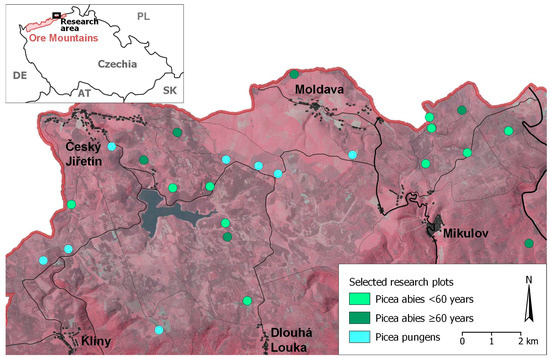 - Šrámek, V.; Balcar, V.; Buriának, V.; Havránek, F.; Jurásek, A.; Liška, J.; Novák, M.; Slodičák, M. Aktualizace Studie. Lesnické Hospodaření v Krušných Horách, 1st ed.; Jíloviště, Výzkumný Ústav Lesního Hospodářství a Myslivosti, v.v.i.: Strnady, Czech Republic, 2015; p. 195. [Google Scholar]