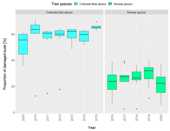 Chicago/Turabian StyleSamek, Michal, Roman Modlinger, Daniel Bat’a, František Lorenc, Jana Vachová, Ivana Tomášková, and Vítězslava Pešková. 2022. "Gemmamyces piceae Bud Blight Damage in Norway Spruce (Picea abies) and Colorado Blue Spruce (Picea pungens) Forest Stands" Forests 13, no. 2: 164. https://doi.org/10.3390/f13020164