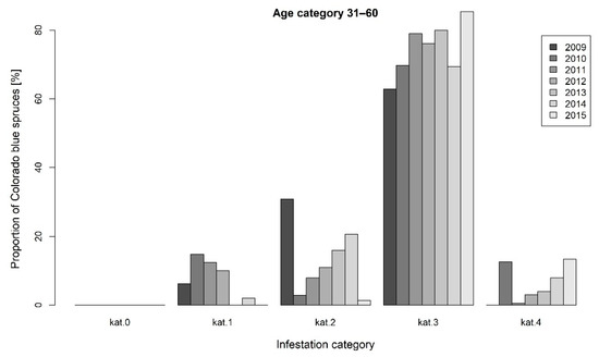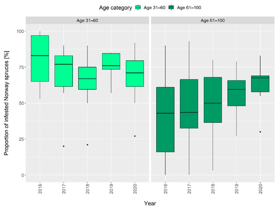 - Pešková, V.; Modlinger, R. Stav napadení smrku pichlavého a ztepilého kloubnatkou smrkovou. Lesn. Práce 2015, 3, 48–49. [Google Scholar]