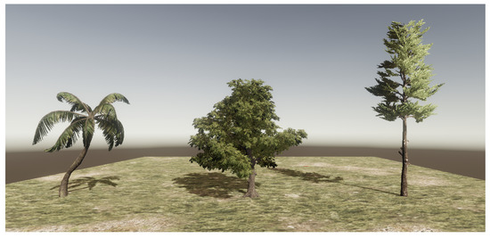 Three different types of tree used in the simulation, from left to right: palm trees, planifolia, and conifers.
