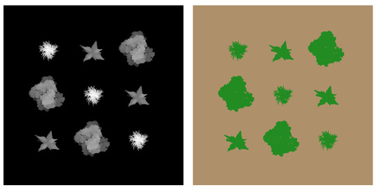 Exported information from the simulator. The left image shows the height maps and the right image shows a segmentation of trees and floor for the Simple Trees Scenario.