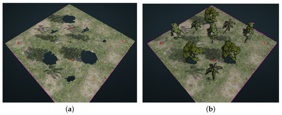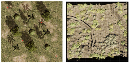 Two different scenarios were considered: Simple Trees (Figure 3, left) and Yosemite (Figure 3, right). The first scenario contains just nine trees of three different types spread over a square shaped region with flat terrain (see Figure 2). The second scenario aims to be a realistic representation of Yosemite National Park [31] by means of a real DTM obtained from LiDAR. Different tree types were randomly placed, followed by manual filling in some areas. Thus, the scenario results in a mix of both dense and sparsely forested areas.