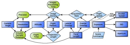 Since these variables are related in non-trivial ways, we present an analysis of these relations. Figure 4 outlines the relations between camera parameters and the rest of the survey settings and reconstruction metrics: arrows represent one parameter impacting in the value of another one, round nodes represent the four mentioned metrics.