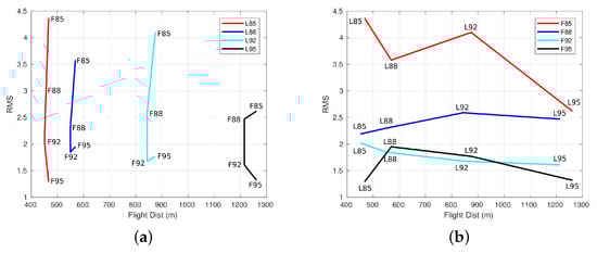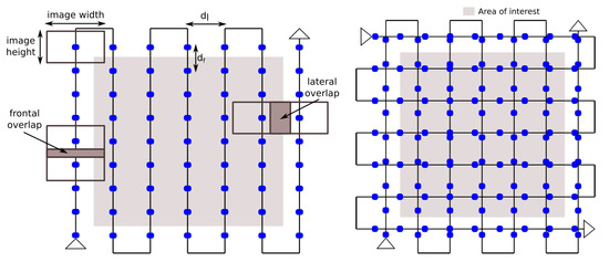 Frontal overlap depends on the image acquisition rate, since higher implies that a greater number of images are acquired during the same time interval (assuming the flight speed remains constant). Thus, the combination of sensor capabilities and minimum flight speed will usually impose a higher bound on . Increasing lateral overlap will reduce . This means that a larger number of passes will be needed to achieve a tighter grid. The longer flight trajectory will result in higher flight time required (again, assuming constant flight speed). In conclusion, increasing will bear the same benefits of larger value but at the expense of longer survey missions, which will usually be limited by the flight autonomy of the UAS.