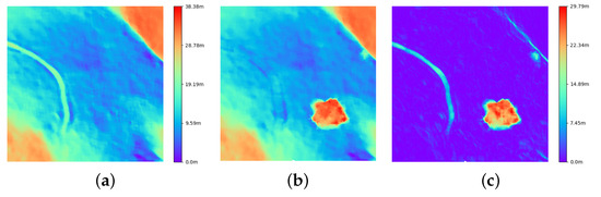 Original orthomosaic of the relevated area (left), DTM with the Default algorithm of ODM (middle) and DTM corrected with our method. (a) Orthomosaic. (b) Default. (c) Proposed Method.