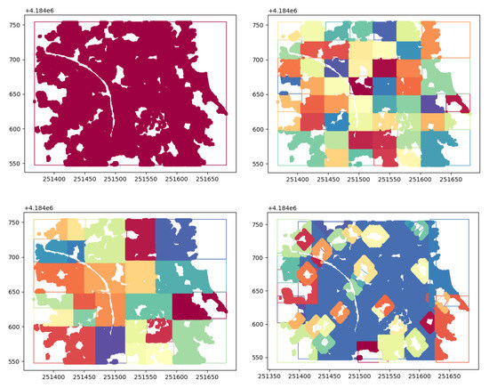 To partition the cloud points, we considered four alternatives: (i) Plane, which considers the entire cloud as a single partition and use only one plane to adjust it; (ii) Uniform Division, an iterative method that divides the cloud in four uniform sections, and continues recursively until either the area covered by each subdivision or the number of points contained in it are below a given threshold; (iii) Median Division, similar to the uniform division, but considering the median of the points number in each area instead. The main idea is to have partitions with the same points number, and (iv) Surrounded, which attempts to find good planes in the areas without points (generally corresponding to dense tree areas), using the border of them to estimate the best plane. The first step is to find all the areas without points, and create a partition for each one containing all the surrounded points. After this, all the remaining points of the cloud are assigned to the same partition.