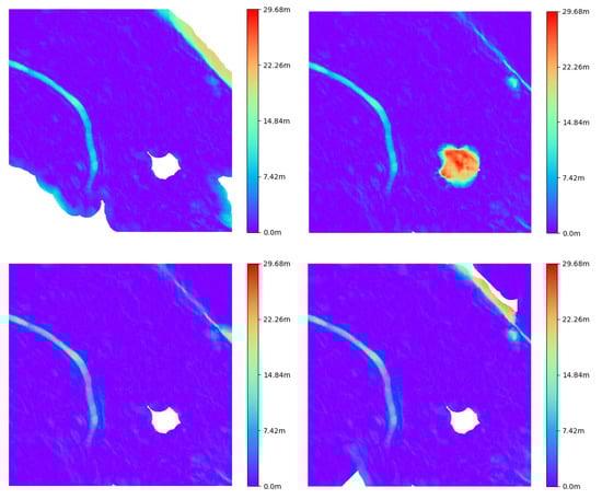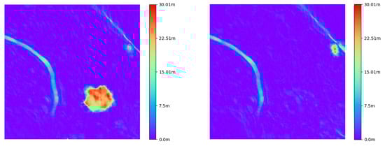 Finally, in Figure 13 we compare the final DTM obtained via ODM and the improved one after applying the reclassification and ground extension methods with the surrounded strategy. We can here see that our approach considerably improves the result, which corresponds to an RMSE improvement from 4.287 to 1.843.