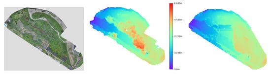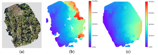 For the study area in Nahuel Huapi National Park, the resulting orthomosaic is presented in Figure 14a and the DTM obtained via ODM with the default configuration is presented in Figure 14b. We can observe that on the right of the image there are some trees (red areas) that were classified as ground and that there are also gaps (white areas) in the map. These issues occur since most of the surface is covered by trees and the default classification method is unable to correctly detect the ground. Both of these problems are solved when using the Algorithm 2 (see Figure 14c), were a mostly flat terrain is detected.