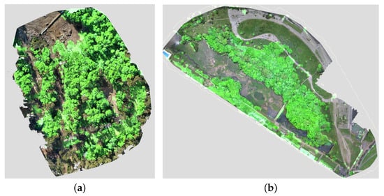 Overlay between orthomosaci and the areas covered by trees (fluor green) for the Villa La Angostura and RECN experiments. (a) VLA. (b) RECN.