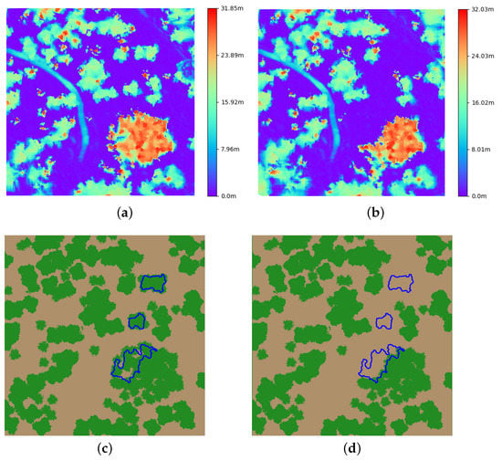 Change detection process for Yosemite. (a) CHM with trees. (b) CHM without trees. (c) Scenario with trees. (d) Scenario without trees.
