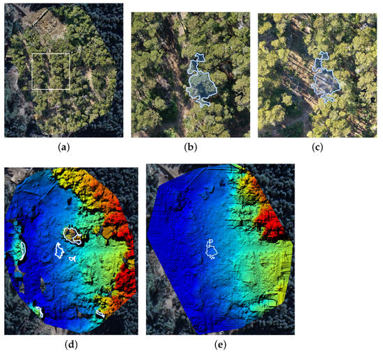 The main idea was to test the selective logging detection described in the previous section, for both cases: using the standard DTM constructed by ODM and in second place the DTM obtained using the proposed method. Figure 20a shows the original orthomosaic of the surveyed area, where some trees were cut down. Figure 20b,c show a zoom of Figure 20a (white rectangle), corresponding to the orthomosaics before and after three trees were cut down. The white lines delimit the area changed between both. To estimate this area we use the algorithm described in Section 2.7 and tested two options: (1) using the default DTM generated with ODM, or (2) using the DTM produced by the proposed method in this work.