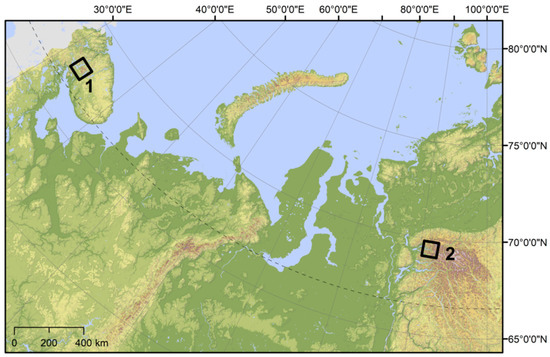 For the analysis of climatic data, the periods of warm and cold seasons were defined as July and October–April for Dudinka, and July and November–April for Kandalaksha. The definition of the warm period corresponded to the phase of the most active growth of vegetation in the study areas. The cold period included months with an average air temperature below 0 °C and stable snow cover. Anomalies of climatic parameters in the warm and cold periods of each year were determined through the calculation of deviations of the current value with respect to the average of the reference period 1961–1990. Linear regressions were fitted to assess trends in data on changes in climatic anomalies, and their coefficients of determination (R2) were calculated.