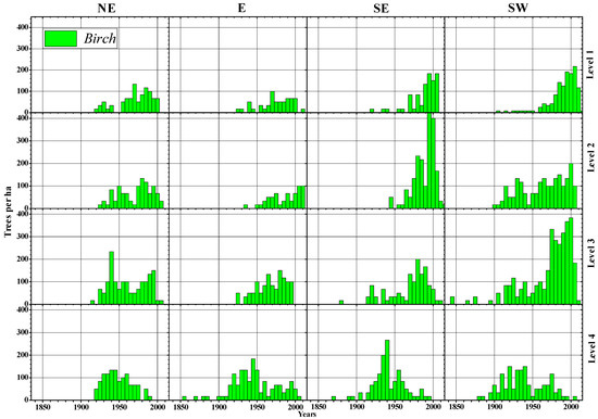 The usage of five-year classes allows us to consider uncertainties in age estimation and also the fact that masting is frequent in some of the study species, such as spruce, which could lead to episodic recruitment peaks [36]. In addition, when a tree forms a multi-stemmed form of growth, such as in the case of mountain birch, difficulties arise in determining the age due to the fact that most of the trunks or sprouts begin to form much later than the time of the appearance of the oldest one forming the basal stump [37].