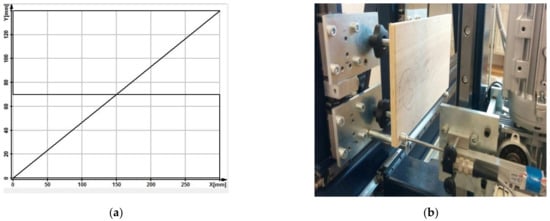 Simultaneously with the verification of the geometry, the density profile was measured, which was carried out for composites seasoned in dry, normal, and humid conditions, using the Grecon device (Alfeld, Germany). For this purpose, three samples from each group of composite were prepared. The material with a cross-section of 50 mm × 50 mm was measured with an electronic caliper with an accuracy of 0.01 mm. The elements were weighed using a laboratory balance with an accuracy of 0.001 g. The density profile was measured at a speed of 0.05 mm/s.