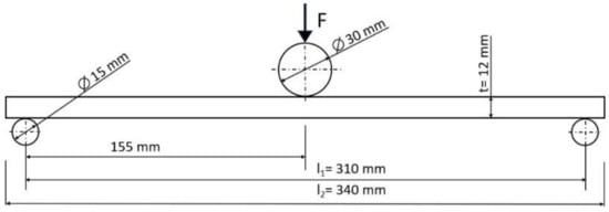 The modulus of elasticity (MOE) for static, dynamic, and fatigue tests was determined based on the EN 310:1994 standard [33]. The experiment was carried out on a TiraTest 2300 testing machine (TIRA GmbH, Schalkau, Germany) in a three-point bending test (Figure 3).
