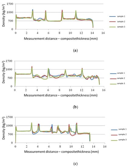 Density profiles of tested samples after air conditioning under conditions of 22 °C and 50% air humidity: (a)—group thick 1, (b)—group thick 2, (c)—group thin.