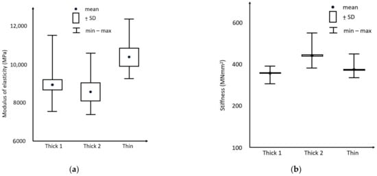 Figure 7 and Figure 8 show the results of testing the modulus of elasticity and stiffness in dry (22 °C and 10% air humidity) and humid (22 °C and 80% air humidity) conditions. The highest value of the modulus of elasticity was achieved when the base layer of samples consisted of pine veneers with a thickness of 1.5–2.5 mm. A greater number of base layers translates into a greater number of adhesive joints, which results in a greater modulus of elasticity achieved in case of both dry and humid conditions. In the case of commercially available composites, the following values were obtained: average modulus of elasticity 8120 MPa and stiffness 333 MNmm2 (for dry conditions—22 °C and 10% air humidity), and 7010 MPa and 287 MNmm2 (for humid conditions—22 °C and 80% air humidity) [38].