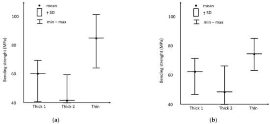 The testing program assumed determination of static bending strength under conditions corresponding to the summer and winter seasons (Figure 6). Tests have shown that the commercially available composites are characterized by an average static bending strength equal to 45 MPa (in dry conditions—T = 22 °C and air humidity 10%), and 42 MPa (in humid conditions—T = 22 °C and air humidity 80%). The produced composites (thick 1, thick 2, and thin) conditioned in 80% air humidity conditions show a higher average value of static bending strength than the commercially available composites. When taking into account quality of the base layer (B, C, D) [26], it can be found that the static bending strength of the samples ranged from 52 to 60 MPa. When testing the conditioned samples under humid conditions, these values were lower by about 5%.