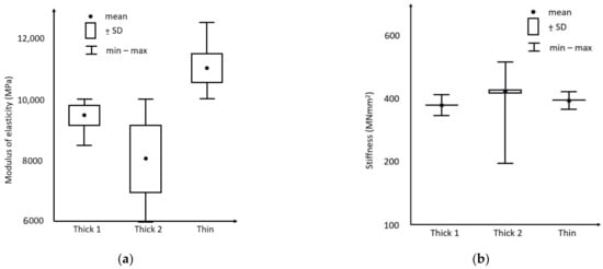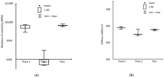 The results of dynamic bending tests by means of modulus of elasticity and stiffness are presented in Figure 9. The values of the modulus of elasticity and stiffness of composites obtained in the dynamic test are analogous to those obtained in the static test. In this case, the obtained values are also higher than for commercially available composites (7400 MPa, 280 MNmm2, respectively) [38,39].