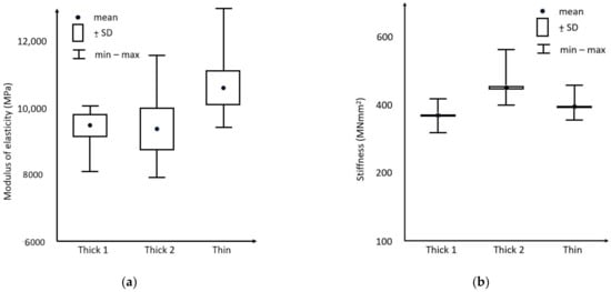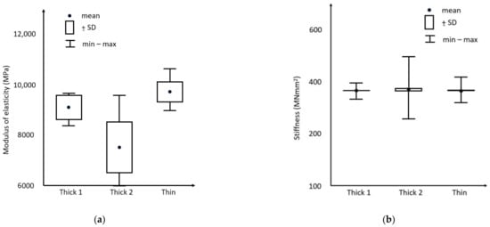 Results of static bending after conditioning under conditions of 22 °C and 50% air humidity: MOE (a), stiffness (b).