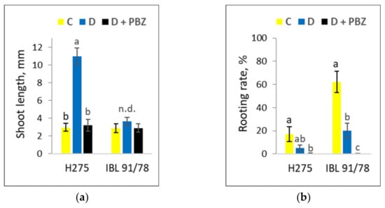 With respect to the rooting rate (Figure 1b), H275, in comparison to IBL 91/78, was generally characterised by a much poorer performance. For instance, in the control variant, the rooting rate of H275 (17.1%) was 3.6 times lower than that of IBL 91/78. Both genotypes had lower rooting rates in the dark than in light; however, this difference was statistically significant only in IBL 91/78, where the rooting rate dropped from 62% to 20% in response to darkness. Furthermore, the combination of darkness and PBZ resulted in zero rooting in both genotypes.