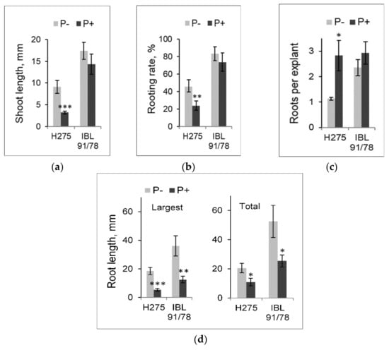 Shoot and root development parameters of Populus genotypes H275 (P. maximowiczii × P. trichocarpa) and IBL 91/78 (P. tremula × P. alba) after four weeks of culturing in glass jars (62 mm × 70 mm) under a 16-h white-light photoperiod. (a) Shoot length (increase from the original 10 mm explant length); (b) Rate of explants with adventitious roots; (c) Root number per explant (with only rooted explants included); (d) Largest and total root length for an individual rooted explant. Nutrient medium differences are denoted: “P−”—control, without plant growth regulators; “P+”—with 1 µmol L−1 of paclobutrazol (PBZ). Significant differences between the control and the PBZ treatment are indicated: * p < 0.05; ** p < 0.01; *** p < 0.001.