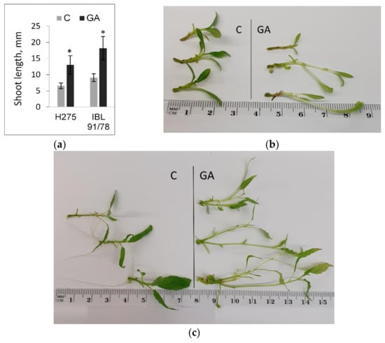 Gibberellin (GA) effects on the development of Populus explants from genotypes H275 (P. maximowiczii × P. trichocarpa) and IBL 91/78 (Populus tremula × P. alba) after three weeks of culturing in glass jars (62 mm × 70 mm) under a 16-h white-light photoperiod. Different variants of nutrient medium are denoted: “C”—control, without plant growth regulators; “GA”—with 1 µmol L−1 of GA4 + 7. (a) Comparison of the average shoot length (increase from the original 10 mm explant length); * indicates significant differences between the control and the GA4 + 7 treatments at p < 0.05. (b) Morphology of H275 explants; (c) morphology of IBL 91/78 explants.