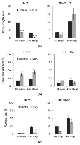 With respect to rooting (Figure 4c), no effect of the ABA could be demonstrated for the H275 explants during the first culture stage, because of the almost total absence of rooted explants in both control and ABA-treated groups. During the second stage, a small portion (21.3%) of the H275 explants from the control treatment formed roots; however, the explants from the ABA-treatment remained largely incapable, not only of shoot elongation but also of root formation, with a significant difference from the control (Figure 4c). For the IBL 91/78 explants, the ABA effect on the rooting rate was negative during the first culture stage, with an eight-fold drop from the control level. However, this negative effect was lost during the second culture stage on the hormone-free medium; here, the IBL 91/78 explants from the control group showed 50% rooting rate and the ABA-treated group followed closely behind, with an insignificant difference (Figure 4c).