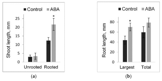Growth parameters of the genotype IBL 91/78 (Populus tremula × P. alba) in the second experimental stage, as affected by abscisic acid (ABA) treatment in the first stage. (a) Shoot length (increase from the original 10 mm explant length), shown separately for unrooted and rooted explants; (b) the largest and total root length for an individual rooted explant. In the first stage, explants were cultured for three weeks in the dark, while being placed on different nutrient media in Petri dishes (55 mm × 12 mm). In the second stage, explants from the two different first stage media were transferred onto fresh hormone-free medium in glass jars (62 mm × 70 mm) and cultured for five weeks under a 16-h white-light photoperiod. The first stage nutrient medium differences are denoted: “Control”—hormone-free medium; “ABA”—medium with 3 µmol L−1 of ABA. Significant differences between the control and the ABA treatment are indicated: * p < 0.05.