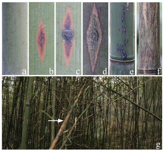 (a) The healthy stem. (b–d) Lesions at different stages of onset infected by rhombic-spot disease. (e) Lesions that connect into one piece or scatter around living bamboo. (f) Lesions that connect into one piece or scatter around dead bamboo. (g) Overall picture of the bamboo forest after infection. The white arrow points to the dead fishscale bamboo.