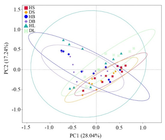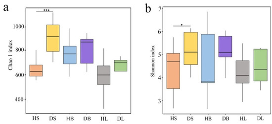 Operational taxonomic unit (OTU) richness, diversity, and structure of phyllosphere fungi from healthy and diseased stems, branches, and leaves. (a) Richness. (b) Diversity. Note: HS, stem samples from healthy fishscale bamboo; DS, stem samples from diseased fishscale bamboo; HB, branch samples from healthy fishscale bamboo; DB, branch samples from diseased fishscale bamboo; HL, leaf samples from healthy fishscale bamboo; DL, leaf samples from diseased fishscale bamboo. * indicates that the difference between HS and DS was significant at 0.05; *** indicates that the difference between HS and DS was significant at 0.001.