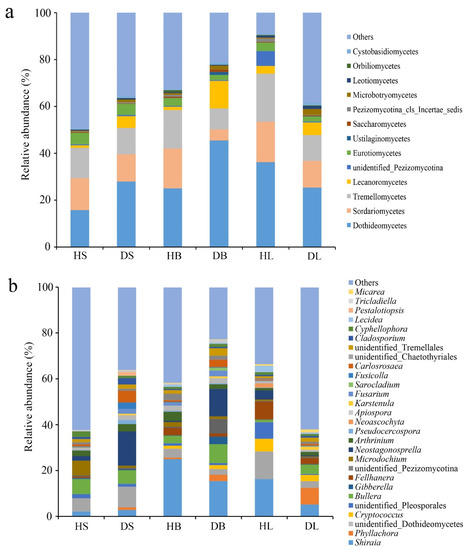 Relative abundance of fungi at the class (a) and genus (b) levels in the healthy and diseased stem, branch, and leaf tissue samples. The fungal class and genus representing < 1% of the total composition were classified as “others”.