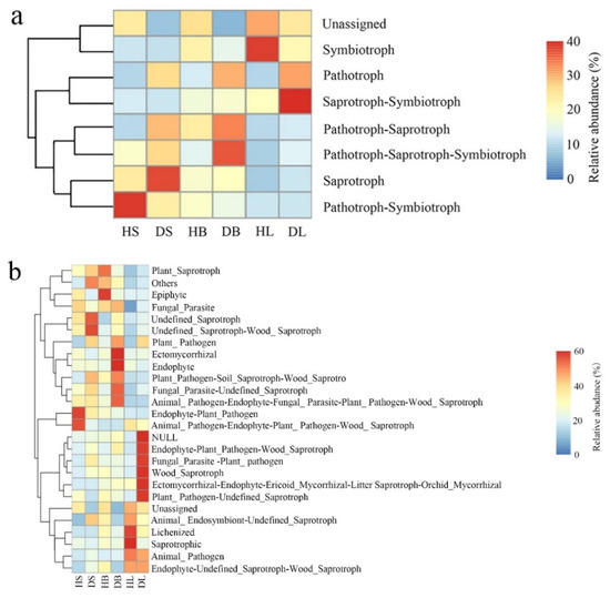 On the other hand, the relative abundance of fungi in different tissues was represented by 26 fungal guild groups (Figure 6b). In general, the fungal guild group abundance varied in different samples. For example, healthy stem tissues were abundantly composed of endophyte–plant pathogen and animal pathogen–endophyte–plant pathogen–wood saprotroph guilds, while undefined saprotroph and undefined saprotroph–wood saprotroph guilds dominated the diseased stem samples. Two guild groups (lichenized and saprotrophic guilds) were predominant in the leaf tissues from healthy samples, and six guild groups (NULL, endophyte-plant pathogen–wood saprotroph, fungal parasite-plant pathogen, wood saprotroph, ectomycorrhizal–endophyte–ericoid mycorrhizal, litter saprotroph–orchid mycorrhizal, and plant pathogen-undefined saprotroph guilds) mainly occurred in the leaf samples from diseased bamboo.