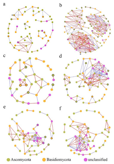 Molecular ecological networks of fungal associations in the fungal communities of healthy and diseased samples. (a) Stem samples from diseased fishscale bamboo. (b) Stem samples from diseased fishscale bamboo. (c) Branch samples from healthy fishscale bamboo. (d) Branch samples from diseased fishscale bamboo. (e) Leaf samples from healthy fishscale bamboo. (f) Leaf samples from diseased fishscale bamboo. Node colors indicate phylum-level taxonomy. Red links indicate positive correlations between nodes, and blue links indicate negative correlations between nodes. Circles marked by black borders in healthy samples represent OTUs that disappeared after onset, and those in diseased samples represent newly emerged OTUs after onset. Circles marked by red borders and * represent the pathogen Neostagonosporella.