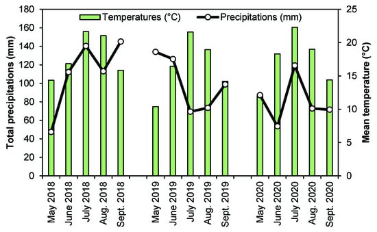The soils at the study site are Dystric Brunisols developed from thick till deposits derived from slate []. They are classified as Magog loam or Ascot sandy loam, with a relatively high stone content in the surficial horizon and a good to imperfect drainage []. Physicochemical characteristics of the soil underneath the poplar buffers were the following: texture, varying from loam to silty loam; pHwater, 6.3; available P, 98 kg/ha; Ca, 4903 kg/ha; K, 226 kg/ha; Mg, 502 kg/ha; cation exchange capacity, 20 meq/100 g; C/N ratio, 9.6; organic matter content, 8.4%; base saturation, 64.7% []. The study area is characterized by a continental moderate subhumid climate, with a growing season of 180 to 190 days []. Thirty-year climate normal data from the nearest meteorological station of Magog indicate a mean annual temperature of 5.6 °C and total annual precipitation of 1142 mm []. Growing season (May to September) temperatures and precipitations are presented on a monthly basis for the three postharvest years covered in this study (2018–2020) (see Figure 1).