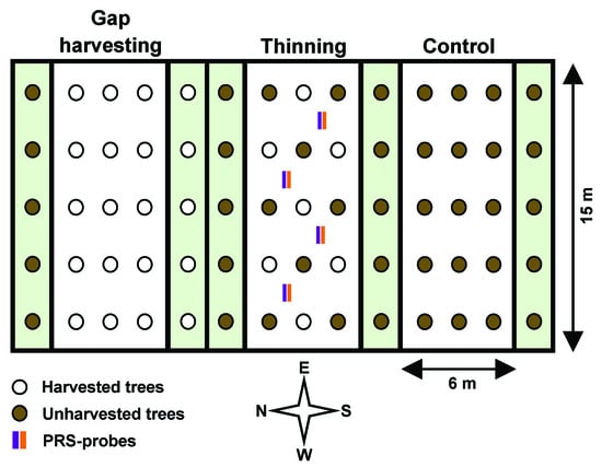Schematic representation of one block of the experimental design with the three harvesting treatment plots (white rectangle) separated by buffer rows (green rectangles). Prior to applying the harvesting treatments at the end of the seventh growing season, each plot contained 15 trees planted with a 2 × 3 m spacing (1666 trees/ha). The hybrid poplar bioenergy buffer width is 15 m. PRS probe placement locations within all plots are shown in the thinning treatment.