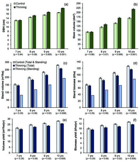 Harvesting treatment effect on (a) diameter at breast height (DBH), (b) stem volume per tree, (c) total stand volume produced, (d) total stand woody aboveground biomass produced, (e) volume yield and (f) aboveground woody biomass yield in hybrid poplar bioenergy buffers after 7 to 10 years of growth. The thinning treatment was performed at the end of the seventh growing season. The p value of the treatment effect is indicated, and vertical bars represent standard errors of the mean for each growing season. In panels (c,d), the standing volume or standing biomass remaining after the thinning treatment is presented. These variables were not used in the ANOVA.