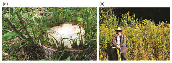 Heavy deer browsing on shoots growing from cut stumps (a) have led to irregular stand regeneration in the gap harvesting treatment after the second postharvest year (b).
