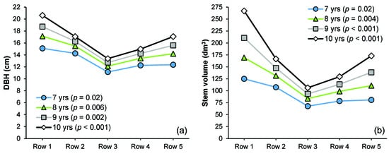 Spatial effect on (a) diameter at breast height (DBH) and (b) stem volume per tree in the control treatment (no harvest) of the hybrid poplar bioenergy buffers. The legend indicates the p value of the spatial effect for the different plantation ages. Standard errors of the mean for the different plantation ages are the following: ±0.8 cm and ±12 dm3 (7 years); ±0.8 cm and ±14 dm3 (8 years); ±0.8 cm and ±15 dm3 (9 years); ±0.9 cm and ±17 dm3 (10 years). Row 1 borders the hayfields.