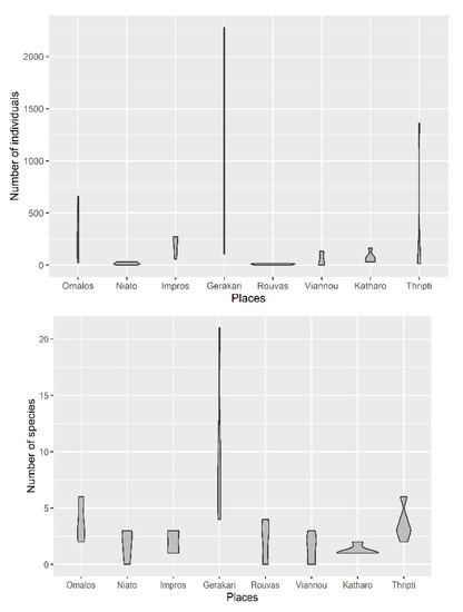 The variation in the number of arthropod specimens per sampled tree is represented in Figure 3 for every sampling locality. The highest number of specimens was observed at the Gerakari site (per tree average: 1352), where the scatter in the number of specimens in the sampled trees was also the greatest (min: 435, max: 2501). The three sites in the Levka Ori showed strong variations in terms of the numbers of specimens. Indeed, Omalos had the highest number of specimens per sampled tree (average: 515.) and a heterogeneous distribution in the number of specimens per sampled tree (min: 167, max: 844). Impros had an intermediate value (average: 221, min: 99, max: 294), while Niato had the lowest number of specimens (average: 35, min: 0 max: 64). The two sites from Dikti were similar in terms of sample sizes per tree. However, in Katharo, fewer samples predominated (the graph is wider at the bottom), whereas in Viannou, samples with a higher number of specimens predominated. Rouvas was similar to Niato and had small samples. In Thripti, the scatter in the number of specimens in the sampled trees was large because one sample included 1396 specimens while the other four samples had between 29 and 290 specimens. Moreover, certain samples from Niato, Rouvas and Viannou had no microarthropods at all (Table 1).