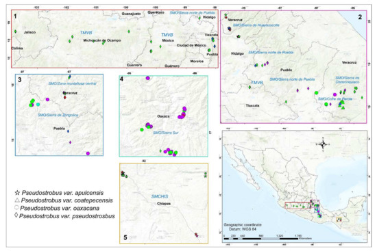 Geographic distribution of sampled populations of Pinus pseudostrobus varieties in central and southern Mexico. Different shapes represent varieties: pseudostrobus (diamond), apulcensis (star), oaxacana (circle) and coatepecensis (triangle). Box outline color and number (1–5) matches region indicated in the map, whereas colors reflect different haplotypes: A (green), B (purple), C (blue), D (red), E (magenta), F (turquoise), G (black), H (pink) and I (yellow). TMVB, Trans-Mexican Volcanic Belt; SMO, Sierra Madre Oriental; SMCHIS, Sierra Madre de Chiapas.