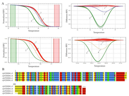 Real-time PCR-HRM analysis with primer set clpP(30204). (A) Representative normalized (left) and difference curves (right) depicting different alleles: clpP(30204)-1 (red), clpP(30204)-2 (green), clpP(30204)-3 (blue) and clpP(30204)-4 (yellow). (B) Sequence alignment comparing the amplicons of the different alleles including primers.