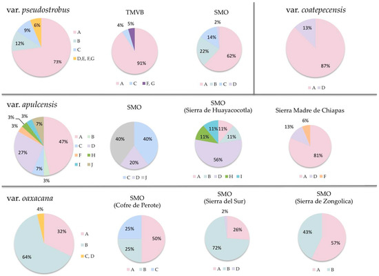 A similar geographical effect was also seen for var. apulcensis, where half of the specimens from eastern Hidalgo, near Apulco, where the type specimen was collected, shared haplotype C and appeared to be more closely related to P. montezumae, whereas the other half showed a unique haplotype J. In contrast, in the Sierra Madre del Sur, in Chiapas, the A haplotype predominated, whereas those from northern Veracruz were conformed mostly by the D haplotype, although various other less-represented variants were also present. This is consistent with other reports analyzing morphological traits [3] and could provide further explanation for the lack of resolution observed in most molecular phylogenetic analyses including these taxa [11,20]. This discontinuous pattern may indicate different geographic lineages for the varieties, with greater introgression or hybridization between P. pseudostrobus and P. montezumae occurring in the TMVB [7] and possibly var. estevezii from the northern range of the SMO, which was not included in this study.