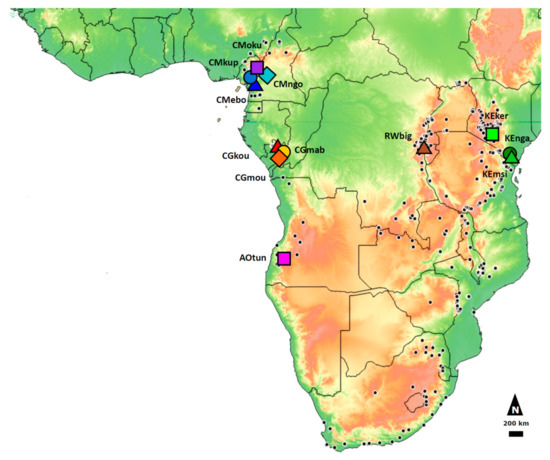 - Demenou, B.B.; Doucet, J.-L.; Hardy, O.J. History of the fragmentation of the African rain forest in the Dahomey Gap: Insight from the demographic history of Terminalia superba. Heredity 2018, 120, 547. [Google Scholar] [CrossRef] [PubMed]