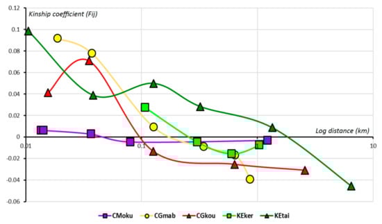 - Hardy, O.J.; Vekemans, X. SPAGeDi: A versatile computer program to analyse spatial genetic structure at the individual or population levels. Mol. Ecol. Notes 2002, 2, 618–620. [Google Scholar] [CrossRef]