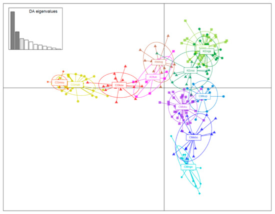 - Jombart, T.; Devillard, S.; Balloux, F. Discriminant analysis of principal components: A new method for the analysis of genetically structured populations. BMC Genet. 2010, 11, 94–109. [Google Scholar] [CrossRef] [PubMed]