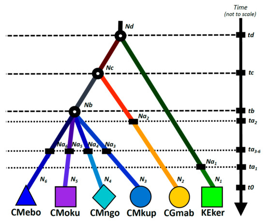 - Cornuet, J.-M.; Pudlo, P.; Veyssier, J.; Dehne-Garcia, A.; Gautier, M.; Leblois, R.; Marin, J.-M.; Estoup, A. DIYABC v2.0: A software to make approximate Bayesian computation inferences about population history using single nucleotide polymorphism, DNA sequence and microsatellite data. Bioinformatics 2014, 30, 1187–1189. [Google Scholar] [CrossRef]