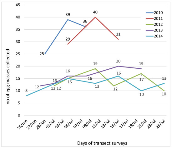 Transect surveys carried out on the cedar stand resulted in the collection of 468 egg masses, during the five years of the study. In 2010 and 2011, three transects were enough to obtain 100 egg masses, with one week delay in 2011 (4–15 July) in relation to 2010 (30 June–8 July). In the following years, fewer egg masses were found and surveys were repeated along all PPM flight periods, without achieving the targeted 100 egg masses (Figure 2).